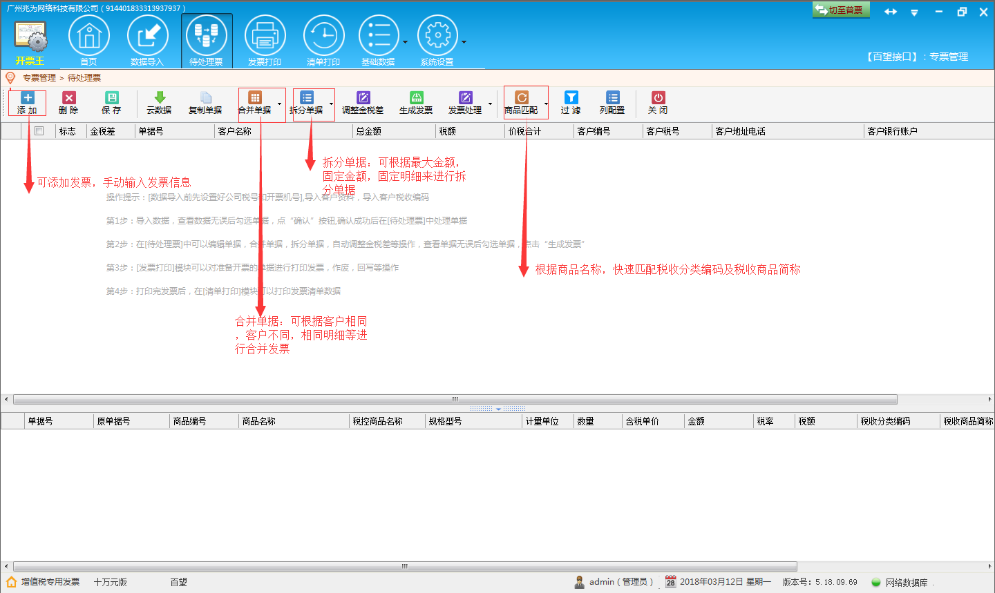 A) 清单控制功能:系统可以支持在引入发票数据时由企业决定是否控制所有的发票数据不打印发票的清单,也就是说如果企业要求所有的发票不打印发票清单,系统则自动将超过8 行明细的发票数据拆成另一张发票数据来填开,如果企业要求打印发票清单,系统则自动将超过8行的发票打印成“货物一批,详见清单”。
